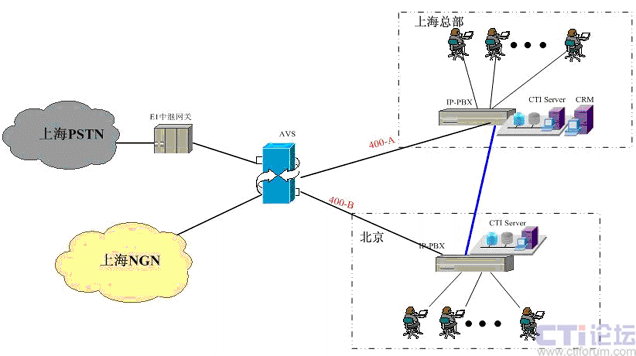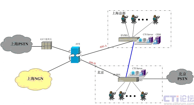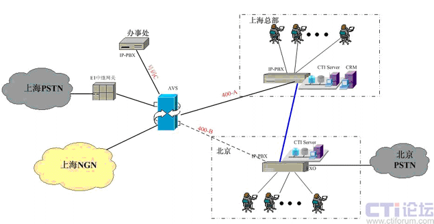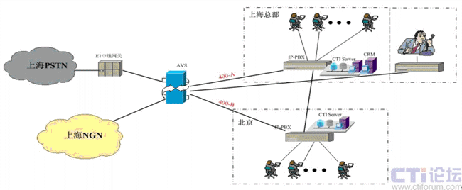 在上海采用傲威通信的AVS軟交換平臺實現(xiàn)VoIP呼叫系統(tǒng)的主叫識別,決定呼叫路由的選定。在上海和北京分別建設IP-PBX和CTI呼叫系統(tǒng),在各辦事處或分公司可根據(jù)選擇是否要建設坐席或普通電話系統(tǒng),所有節(jié)點的呼入呼出統(tǒng)一從上海出口實現(xiàn)出入。