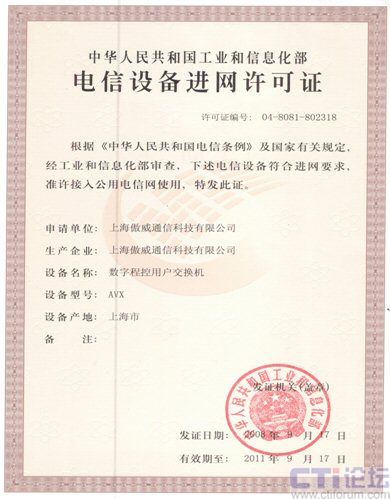 近日,國內(nèi)知名的VOIP全系列產(chǎn)品和解決方案提供商---傲威通信科技有限公司,自主研發(fā)的AVX系列語音電話交換機(jī)順利通過工業(yè)與信息化部審核,取得“電信設(shè)備進(jìn)網(wǎng)許可證”。此舉標(biāo)志著傲威通信的AVX系列產(chǎn)品已成功取得接入國家電信網(wǎng)的資質(zhì),為大規(guī)模的推廣應(yīng)用打下了堅(jiān)實(shí)基礎(chǔ)。