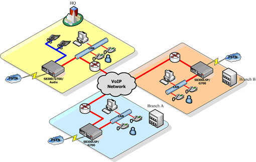 各地之間通過H.323 IP Trunk將彼此連接在一起。G700媒體網關提供了強大的VoIP DSP,一個媒體網關在不增加VoIP資源卡 (MM760)的情況下,以同時支持64路G.711壓縮標準的語音通信。