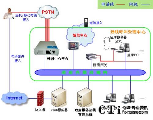 - 公民電子郵件通過internet網(wǎng)絡(luò)接入web服務(wù)器,然后通過web服務(wù)器接入呼叫中心平臺,然后進(jìn)入熱線系統(tǒng);