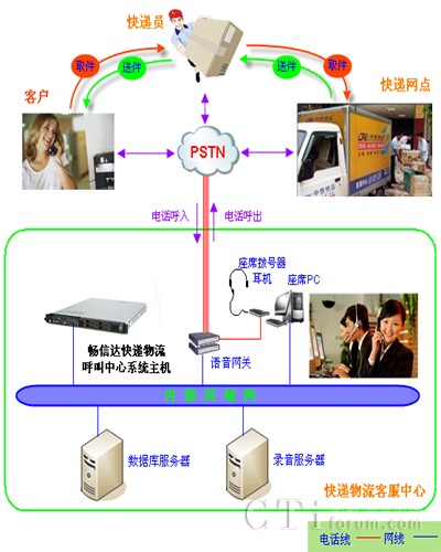 暢信達(dá)快遞物流呼叫中心系統(tǒng)是以暢信達(dá)快遞物流呼叫中心系統(tǒng)主機(jī)為呼叫交換和業(yè)務(wù)受理平臺,選配數(shù)據(jù)庫服務(wù)器和錄音服務(wù)器,采用人工座席接聽來電與發(fā)起呼叫,系統(tǒng)架構(gòu)圖如下: