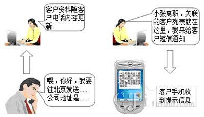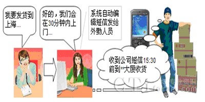 外勤短信通知?蛻綦娫捪聠,貨品規(guī)格重量記入數(shù)據(jù)庫,下單完畢,客服人員選擇片區(qū)取件員,輕輕一點(diǎn),客戶資料及貨物資料全部發(fā)送至取件員手機(jī),不會遺忘,不再混淆。