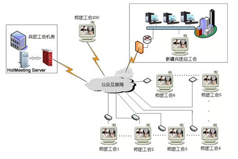 新疆建設(shè)兵團(tuán)工會(huì)下設(shè)有14個(gè)師工會(huì),111個(gè)團(tuán)場(chǎng)工會(huì).共有200個(gè)用戶(hù)同時(shí)參加視頻會(huì)議。中心服務(wù)器帶寬為100M光纖,各地終端通過(guò)網(wǎng)通2M寬帶接入,每個(gè)師、團(tuán)級(jí)會(huì)場(chǎng)都有自己獨(dú)立的機(jī)房和會(huì)議室,適合進(jìn)行基于IP網(wǎng)絡(luò)視訊會(huì)議的應(yīng)用,在這個(gè)網(wǎng)絡(luò)平臺(tái)上,優(yōu)視(URSACOM)HotMeeting富媒體視頻會(huì)議系統(tǒng)所提供的高質(zhì)量的視頻圖像和方便易用的文檔、文件共享功能,使得兵團(tuán)工會(huì)領(lǐng)導(dǎo)能夠在這個(gè)平臺(tái)上進(jìn)行從桌面討論到會(huì)議室正式會(huì)議等各種規(guī)模應(yīng)用。通過(guò)HotMeeting富媒體視頻會(huì)議系統(tǒng),除了進(jìn)行全團(tuán)工會(huì)系統(tǒng)例會(huì),工作交流等常見(jiàn)的應(yīng)用之外,遠(yuǎn)程培訓(xùn)等也是經(jīng)常進(jìn)行的內(nèi)容。各個(gè)師、團(tuán)工會(huì)系統(tǒng)能利用數(shù)據(jù)功能和兵團(tuán)總工會(huì)協(xié)調(diào)業(yè)務(wù),也能把平常培訓(xùn)的會(huì)議材料進(jìn)行詳細(xì)介紹,節(jié)約了以前培訓(xùn)所花費(fèi)的大量精力和時(shí)間。具體網(wǎng)絡(luò)拓?fù)湟?jiàn)下圖: