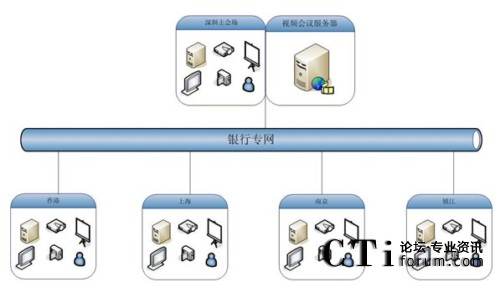 如圖,大新銀行視頻會(huì)議系統(tǒng)應(yīng)用規(guī)模為5個(gè)點(diǎn),包括香港、深圳、上海、南京、鎮(zhèn)江,服務(wù)器部署在深圳用來(lái)保證香港和內(nèi)地的鏈接效果,服務(wù)器出口帶寬為5M共享,各分會(huì)場(chǎng)通過(guò)專網(wǎng)訪問(wèn)服務(wù)器。在這個(gè)網(wǎng)絡(luò)平臺(tái)上,紅杉樹網(wǎng)絡(luò)視頻會(huì)議所提供的高質(zhì)量音視頻圖像、方便易用的文檔、文件共享數(shù)據(jù)功能,使得大新銀行能夠在這個(gè)平臺(tái)上進(jìn)行從桌面討論到會(huì)議室正式會(huì)議等各種規(guī)模的應(yīng)用。在這個(gè)平臺(tái)上,除了進(jìn)行日常例會(huì)、業(yè)務(wù)交流等常見(jiàn)的應(yīng)用之外,業(yè)務(wù)培訓(xùn)、異地招聘等也是經(jīng)常進(jìn)行的內(nèi)容。業(yè)務(wù)人員利用數(shù)據(jù)功能,把平常培訓(xùn)很難懂的新銀行產(chǎn)品、費(fèi)率等進(jìn)行介紹,節(jié)約了以前培訓(xùn)所花費(fèi)的大量精力和時(shí)間,為新產(chǎn)品迅速占領(lǐng)市場(chǎng)掌握了主動(dòng)。