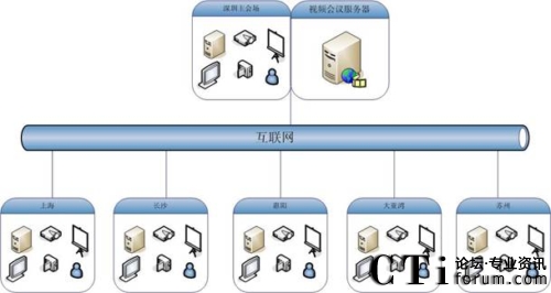 如圖,深圳南山地產(chǎn)視頻會議系統(tǒng)應用規(guī)模為6個點,包括深圳、上海、長沙、惠陽、大亞灣、蘇州。服務器部署在深圳用來保證香港和內地的鏈接效果,服務器出口帶寬為3M共享,各分會場通過互聯(lián)網(wǎng)訪問服務器。在這個網(wǎng)絡平臺上,紅杉樹網(wǎng)絡會議所提供的高質量音視頻圖像、方便易用的文檔、文件共享數(shù)據(jù)功能,使得南山地產(chǎn)能夠在這個平臺上進行從桌面討論到會議室正式會議等各種規(guī)模的應用。在這個平臺上,除了進行日常例會、業(yè)務交流等常見的應用之外,業(yè)務培訓、異地招聘等也是經(jīng)常進行的內容。業(yè)務人員利用數(shù)據(jù)功能,節(jié)約了以前培訓所花費的大量精力和時間,為新項目迅速占領市場掌握了主動。
