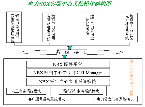 該方案以美國3COM公司的NBX產(chǎn)品為系統(tǒng)平臺,結(jié)合其配套的中間件產(chǎn)品CTI-Manager和上層第三方專業(yè)的電力行業(yè)應(yīng)用系統(tǒng),為各省、市電業(yè)公司建立起新型的電力呼叫中心(Call Center)。使電力客服中心系統(tǒng)以呼叫中心為基礎(chǔ),以電力系統(tǒng)其他后方資源信息(CIS,DMS,負(fù)控等系統(tǒng))為依托,為客戶提供電話、傳真、郵件、Internet等多種接入方式,通過和電力其他業(yè)務(wù)系統(tǒng)有機的結(jié)合,滿足客戶不同層次、個性化與多樣化的業(yè)務(wù)需求,提供了包括錄音、會議電話、統(tǒng)一消息和智能路由在內(nèi)的多種功能。