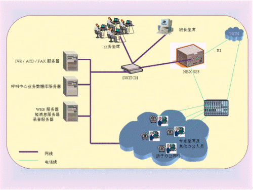 NBX SS3 網(wǎng)絡(luò)電話交換機(jī)作為基礎(chǔ)通信平臺,由北大方正電子技術(shù)有限公司在北京網(wǎng)音公司呼叫中心中間件進(jìn)行集成開發(fā),建立CTI,ACD、IVR、FAX、TTS及其應(yīng)用服務(wù),集成現(xiàn)有的WEB、mail、短消息系統(tǒng),建立統(tǒng)一消息平臺,新建和利用各業(yè)務(wù)數(shù)據(jù)庫,設(shè)計業(yè)務(wù)坐席及客戶端軟件。