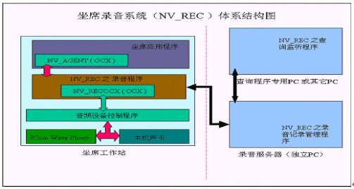 NV-REC 專用錄音系統(tǒng)與傳統(tǒng)的使用錄音板卡對(duì)坐席(電話)并線錄音的方式截然不同,由于3Com IPCC的所有坐席服務(wù)均是通過安裝在坐席終端上的軟件電話,通過聲卡、耳機(jī)來(lái)實(shí)現(xiàn)與客戶的電話溝通的。我們是直接監(jiān)測(cè)軟件電話,從聲卡設(shè)備通道中直接形成實(shí)時(shí)語(yǔ)音通話的標(biāo)準(zhǔn)WAV文件,從而完成對(duì)坐席的全程錄音功能。