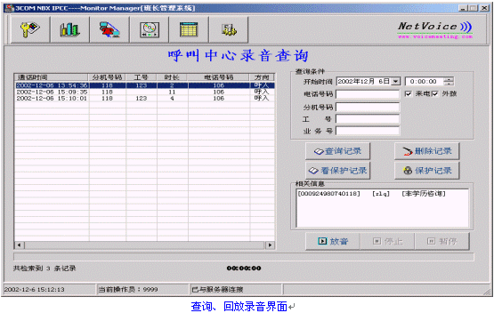 NetVoice作為3Com NBX網(wǎng)絡(luò)電話產(chǎn)品中國(guó)區(qū)總分銷,在積累大量3Com IPCC開發(fā)應(yīng)用經(jīng)驗(yàn)的基礎(chǔ)上,通過對(duì)3Com NBX產(chǎn)品技術(shù)特性的詳盡分析,并結(jié)合其它錄音產(chǎn)品的成功開發(fā)經(jīng)驗(yàn),成功的在3Com