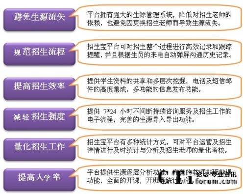 招生寶是建立在網(wǎng)音IPS一對(duì)多呼叫中心平臺(tái)上的集成電話、短信、郵件等功能一體的輔助招生系統(tǒng),實(shí)現(xiàn)招生咨詢、信息發(fā)布、生源跟蹤、課程定義、教師管理、即時(shí)提示、統(tǒng)計(jì)分析等招生實(shí)用功能。實(shí)現(xiàn)招生過(guò)程的信息化、高效化、精細(xì)化和人性化管理的高效招生平臺(tái),也是教育培訓(xùn)機(jī)構(gòu)必不可少的招生信息平臺(tái)。
