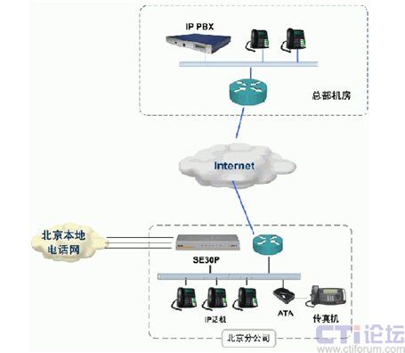 如上圖所示,通過SE30P的內(nèi)置FXO接口,可以實現(xiàn)與北京PSTN網(wǎng)絡的互聯(lián),解決北京分公司與中國用戶的通信;通過SE30P的IP中繼方式,實現(xiàn)與總部的IP PBX互聯(lián),變國際長途為內(nèi)部通話,為公司節(jié)省了大量辦公費用;公司內(nèi)部使用IP話機作為人工總機和分機,并通過ATA實現(xiàn)傳真接入。