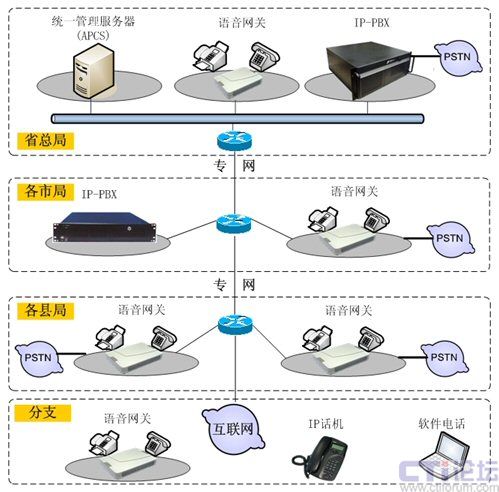 摘要:公司Zed-3(捷思銳科技)公司借助工商系統(tǒng)現(xiàn)有的數(shù)據(jù)專網(wǎng),在省局部署大型IP PBX,負(fù)責(zé)省局的分機注冊以及整套系統(tǒng)的路由規(guī)劃,在各市局部署中型IP PBX,負(fù)責(zé)市、縣局的分機注冊――充分利用現(xiàn)有資源、降低工作費用,擴展新業(yè)務(wù),推進(jìn)工商系統(tǒng)通信網(wǎng)絡(luò)的全面提升。