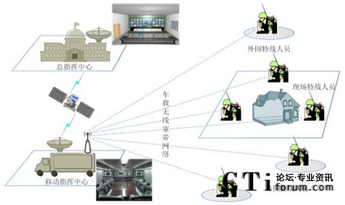 移動(dòng)指揮中心可在執(zhí)行任務(wù)的時(shí)候開往作戰(zhàn)現(xiàn)場(chǎng)附近,車上部署一整套車載調(diào)度平臺(tái),作為現(xiàn)場(chǎng)指揮人員進(jìn)行調(diào)度指揮使用,同時(shí)在指揮車上部署無(wú)線寬帶網(wǎng)絡(luò),作為戰(zhàn)場(chǎng)使用,移動(dòng)指揮車和總指揮中心可通過(guò)衛(wèi)星網(wǎng)絡(luò)實(shí)現(xiàn)互聯(lián)互通。