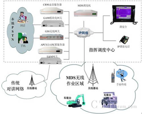 MDS系統(tǒng)可以應(yīng)用于各種作業(yè)現(xiàn)場的指揮調(diào)度, MDS系統(tǒng)不但支持系統(tǒng)基本的語音通信,調(diào)度中心可以通過視頻、數(shù)據(jù)、文本消息等綜合的多媒體方式與作業(yè)人員進(jìn)行通信交互,滿足各種復(fù)雜環(huán)境下的指揮調(diào)度需求。系統(tǒng)可以通過GS8無線網(wǎng)關(guān)、GA90