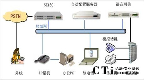 此方案適用于已經(jīng)部署了傳統(tǒng)PBX的企業(yè)。要求企業(yè)部署好數(shù)據(jù)網(wǎng)絡(luò),如果采用模擬終端,則企業(yè)的各個(gè)辦公點(diǎn)需要先將網(wǎng)絡(luò)線路和電話線路部署到位,同時(shí)企業(yè)原有的PBX要預(yù)留與SE150對(duì)接的接口。