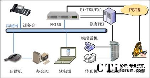 中小型企業(yè)語音通信系統(tǒng)集IP-PBX、語音網(wǎng)關(guān)、互聯(lián)網(wǎng)網(wǎng)關(guān)等多種功能于一身,可以兼容傳統(tǒng)PBX的全部功能,同時(shí)也可作為VoIP網(wǎng)關(guān)使用,把基于IP的SIP通訊轉(zhuǎn)換成PSTN通訊。通過采用開放的標(biāo)準(zhǔn)協(xié)議,系統(tǒng)(SE150)可以兼容眾多國際、國內(nèi)IP電話、語音網(wǎng)關(guān)廠家的產(chǎn)品。