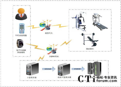 物聯(lián)網關:包括電信網關和zigbee網關。電信網關傳輸短信給客戶手機提醒客戶的健身安排,zigbee網關應用于單個健身房內,用于傳輸客戶的運動情況和消費信息以及健身器材的使用情況給健身房的服務器。