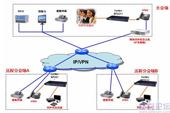 當(dāng)視頻會議召開時,主會場的翻譯既通過同聲傳譯系統(tǒng)把翻譯好的內(nèi)容傳輸?shù)奖镜氐呐c會者,也通過IP音頻會議系統(tǒng)把翻譯好的內(nèi)容傳輸?shù)竭h(yuǎn)端的會場,遠(yuǎn)端會場把音頻系統(tǒng)傳輸過來的聲音經(jīng)過EF2211聲音處理系統(tǒng)處理后傳輸?shù)酵晜髯g系統(tǒng),同聲傳譯系統(tǒng)把聲音經(jīng)無線耳機(jī)傳送給需要的與會者。這樣遠(yuǎn)端會場的與會者既可以聽到主會場的原聲,也可以聽到翻譯好的內(nèi)容。相反,當(dāng)分會場發(fā)言時分會場也可以把本會場的原聲和翻譯好的內(nèi)容傳輸?shù)街鲿䦂觥_@樣就可以實現(xiàn)遠(yuǎn)程同聲傳譯。能同時滿足與會的所有人員的翻譯需求,既做到翻譯內(nèi)容的統(tǒng)一,又節(jié)省了翻譯人員的人力成本。