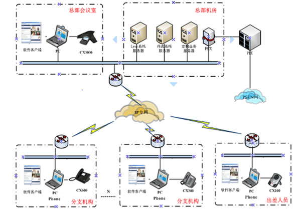 在方案的推進過程中,我們在各大會議室部署了CX3000、在桌面分別部署了CX600與IP331。通過這些終端的自身的優(yōu)勢及與系統(tǒng)的配合,實現(xiàn)了完整的電話體驗、PSTN無縫結(jié)合、LYNC完整的企業(yè)級語音功能、 高清晰語音質(zhì)量 、專業(yè)的語音會議等用戶需求。現(xiàn)在此方案在鳳凰網(wǎng)的會議室及桌面的應用效果良好,場景應用圖如下: