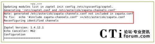 下圖為運(yùn)行上述命令的輸出,從輸出我們可以發(fā)現(xiàn)一個(gè)問題,(使用本文的所用的軟件版本可能會出現(xiàn)的一個(gè)問題,其他的版本不一定會出現(xiàn)),/etc/asterisk/zapata-channels.conf