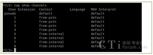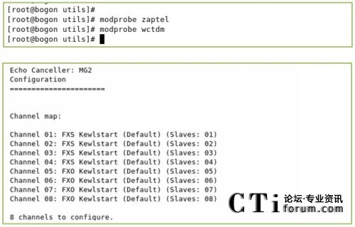 上面的輸出表示A1200P的通道都已識別,驅(qū)動安裝成功(本文用的是8個(gè)FXS口,上面的channel 01到channel 08是FXs口,后面的FXO表示它們使用的是FXO的信令,并不是表示它們是FXO口,這一點(diǎn)大家應(yīng)該注意)