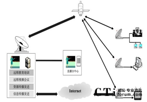 衛(wèi)星通信系統(tǒng)能實(shí)現(xiàn)組播、多點(diǎn)傳送和多媒體通信,支持多種媒體內(nèi)容的高速寬帶傳輸,時單向、雙向交互式的現(xiàn)代遠(yuǎn)程教育培訓(xùn),音視頻節(jié)目的實(shí)時播出和傳送,多媒體培訓(xùn)資源和數(shù)據(jù)的推送,音視頻、數(shù)據(jù)同步交互的遠(yuǎn)程視頻會議,信息資源的傳播和發(fā)送。