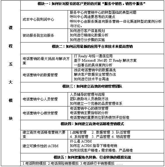 本課程以系統(tǒng)化的眼光,結(jié)合多個國際國內(nèi)領(lǐng)先企業(yè)的營銷與管理實踐案例,與您分享國內(nèi)領(lǐng)先的呼叫中心和電話營銷中心的戰(zhàn)略與運營經(jīng)驗,對現(xiàn)有資源進行合理評估,解決實際問題與困惑,突破面臨的瓶頸,整個課程具有高度的實戰(zhàn)性與可操作性。
