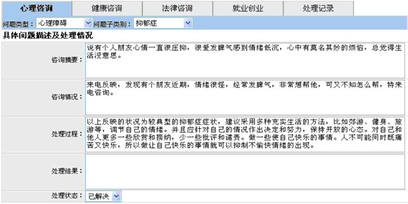 對于每次咨詢的受理以及答復(fù)記錄,是青少年咨詢平臺的重要組成部分。針對青少年的心理特點(diǎn)咨詢問題的類別,專門開發(fā)“12355”青少年服務(wù)臺業(yè)務(wù)受理系統(tǒng)。通過對來訪者的資料的登記,以及對咨詢服務(wù)的詳細(xì)記錄和電話錄音,今后可方便的查詢服務(wù)臺的的咨詢情況,并能有效的跟蹤處理,青少年遇到的心里、求學(xué)、婚姻和法律維權(quán)等方面的訴求。并能快速準(zhǔn)確的統(tǒng)計(jì)服務(wù)臺的各項(xiàng)服務(wù)的數(shù)據(jù)。