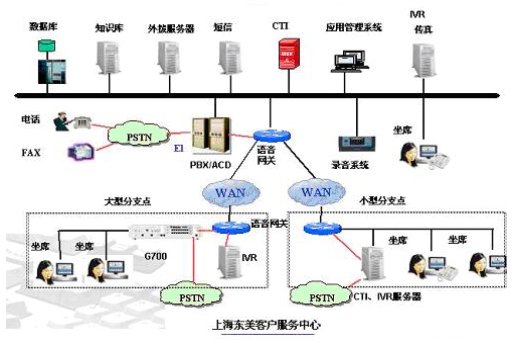 中心點和分支點的客服系統(tǒng)通過兩地的語音網(wǎng)關進行語音連接,具體實現(xiàn)大概是,如果分支點需要把語音轉接到中心點,分支點把TDM語音轉接到語音網(wǎng)關,語音網(wǎng)關把TDM語音信號轉變?yōu)镮P包,通過網(wǎng)絡發(fā)送到中心點的語音網(wǎng)關上,語音網(wǎng)關把IP包變?yōu)門DM語音信號,在接入到交換機上,由中心點CTI按照指定的策略轉接到最終目標上。