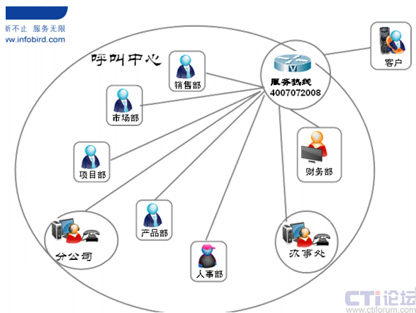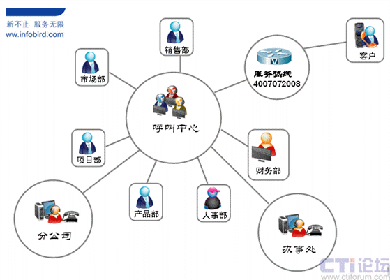 訊鳥軟件現(xiàn)有員工150人,總部位于北京,在上海設(shè)有一個分公司,在廣州、深圳分別設(shè)有一個辦事處。通過將呼叫中心與企業(yè)運(yùn)營管理的融合,大大提高了員工的工作效率,降低了運(yùn)營管理成本。訊鳥軟件副總裁姜冬良先生告訴我們,自2007年6月在企業(yè)運(yùn)營管理中加入呼叫中心之后,所有員工對外聯(lián)系的名片上只有公司的400號碼和員工分機(jī),不再顯示員工的手機(jī),這樣有效的避免了因為員工流失造成的客戶服務(wù)無法及時響應(yīng)的現(xiàn)象,同時,所有員工的工作狀態(tài)可以通過報表系統(tǒng)有效的衡量,尤其是銷售人員和分公司、辦事處人員的工作,管理層可以及時的檢查、監(jiān)督和糾正。