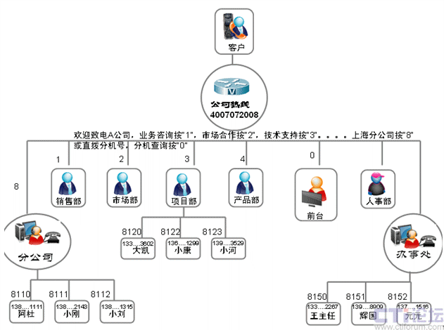 一直以來,呼叫中心座席的形式比較固定,大都通過長期坐在辦公室的人員使用PC機(jī)和電話機(jī)結(jié)合的方式進(jìn)行工作。但是,這種形式顯然不能滿足中小企業(yè)運(yùn)營管理的需要,在以銷售為重的中小企業(yè)中大部分人員并不完全坐在辦公室工作,如客戶經(jīng)理、客戶服務(wù)工程師,即使坐在辦公室,也不會一直在等著接電話,如開發(fā)工程師、生產(chǎn)車間的人員等等。如何既要滿足企業(yè)運(yùn)營的需要,又要實現(xiàn)呼叫的管理和分配呢?我們只需要將座席的形式簡化,將呼叫分配的目標(biāo)擴(kuò)大就可以了。手機(jī)是目前最常見和普遍的通信工具,只要我們將手機(jī)做為座席進(jìn)行管理,既不改變現(xiàn)有的組織架構(gòu),又能充分利用呼叫分配工作并對工作人員進(jìn)行管理,這將大大提高中小企業(yè)運(yùn)營管理的靈活性和變通性。企業(yè)組織架構(gòu)如下:
