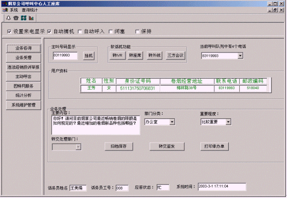 客戶打入電話后,當(dāng)系統(tǒng)的自動語音應(yīng)答子系統(tǒng)無法解決客戶問題時,客戶可選擇人工服務(wù),由企業(yè)客戶服務(wù)代表直接接聽客戶電話,處理并解決客戶問題。此時客戶同座席話務(wù)人員直接溝通,并同時記錄下該客戶的聯(lián)系方式,將相關(guān)數(shù)據(jù)添加入系統(tǒng)數(shù)據(jù)庫;也可以在數(shù)據(jù)庫的支持下回答接受查詢卷煙/價格/限額/新品種、卷煙經(jīng)營規(guī)范制度/卷煙專賣政策法規(guī)咨詢、通報最近暢銷卷煙的限額情況/通報最近增加的新品種/煙草公司召集的活動通知、投訴和舉報違法經(jīng)銷行為、卷煙預(yù)訂、電話訪銷、滿意度調(diào)查等。