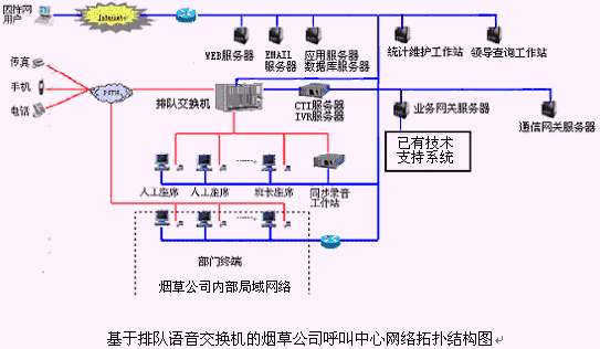 該煙草公司呼叫中心主要是由語音交換機(jī)、CTI服務(wù)器、IVR(交互式語音應(yīng)答)/IFR(交互式傳真應(yīng)答)子系統(tǒng)、人工座席子系統(tǒng)、應(yīng)用服務(wù)器、數(shù)據(jù)庫服務(wù)器、業(yè)務(wù)網(wǎng)關(guān)子系統(tǒng)、通信網(wǎng)關(guān)子系統(tǒng)等硬件設(shè)備和應(yīng)用軟件組成。