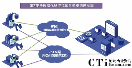 消防網絡傳輸設備通過以太網(TCP),電話線(PSTN),無線(GPRS、CDMA)將火災報警主機接收到的火警及運行信息上傳的鋼廠消防安全監(jiān)控指揮中心。