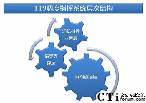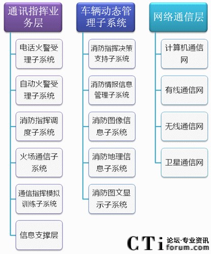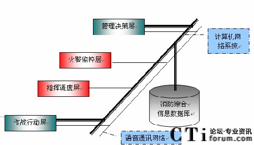 通過對消防安全監(jiān)控指揮中心業(yè)務的分析,引進先進的數據通信網絡和語音通訊網絡,我們可以將未來的消防業(yè)務層次抽象地概括為四層(如圖所示):管理決策層、火警監(jiān)測層、指揮調度層和作戰(zhàn)行動層。與管理決策層對應的組織機構為消防通信指揮中心;與火警檢測層、指揮調度層對應包括消防指揮中心的接處警子系統、指揮調度等子系統;與作戰(zhàn)行動層對應的組織機構為消防站(消防隊)和消防車及消防隊員。