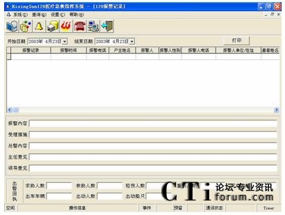 該庫記錄每個120報警被最終處理的全過程,記錄包括報警有關(guān)信息、急救措施、調(diào)度命令、涉及的有關(guān)人員等信息。每個120報警被記錄后便不允許刪除。系統(tǒng)只允許有權(quán)限的用戶進(jìn)行查詢、統(tǒng)計、匯總、生成報表并打印出來。