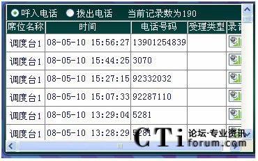 當(dāng)電話打進(jìn)來,話務(wù)員提話機(jī)時(shí)系統(tǒng)便自動(dòng)進(jìn)行錄音,系統(tǒng)把語音信號以數(shù)字化語音格式寫入硬盤。同時(shí)系統(tǒng)記錄其通話日期、摘機(jī)時(shí)間、掛機(jī)時(shí)間和當(dāng)前通話時(shí)間等信息,如果該次電話為打出電話,還可記錄其打出的電話號碼。當(dāng)值班人員掛機(jī)時(shí)系統(tǒng)便會(huì)自動(dòng)停止錄音。