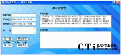 可以將多次惡意騷擾、誤撥的電話,加入到黑名單中,可設(shè)定鎖定時(shí)限,并可查詢管理屏蔽列表和過期列表。