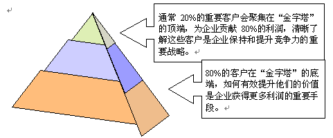 。。從抽象和通用的意義上講,多數(shù)企業(yè)的客戶價(jià)值分布是適合"二八法則"的,即20%的客戶創(chuàng)造了80%的利潤。但對(duì)每個(gè)企業(yè)而言,要洞察"究竟哪些客戶才是最有價(jià)值的客戶?""這些客戶在哪些方面的價(jià)值最大?""他們有什么共同的特征?"卻不是一件很容易的事。目前,多數(shù)企業(yè)的管理方式還停留在根據(jù)某一項(xiàng)或兩項(xiàng)單一指標(biāo)(如銷售額或利潤)來作的客戶排行,無法進(jìn)行多方位的綜合的客戶價(jià)值分析、管理。而要實(shí)現(xiàn)"以客戶為中心"的CRM理念,就必須建立一套全面的客戶價(jià)值評(píng)估管理系統(tǒng),并利用系統(tǒng)強(qiáng)大的數(shù)據(jù)分析、挖掘功能,快速地進(jìn)行客戶群價(jià)值細(xì)分管理,建立起客戶價(jià)值金字塔。