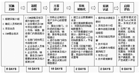 首先,組建東風(fēng)設(shè)備廠CRM實(shí)施小組,進(jìn)行項(xiàng)目動(dòng)員和CRM理念培訓(xùn)工作,使各級人員建立起"以客戶為中心"的意識;然后,TurboCRM以"第三方"的身份,對業(yè)務(wù)進(jìn)行梳理,將市場、銷售、服務(wù)中各環(huán)節(jié)的關(guān)鍵點(diǎn)提煉出來,找出隱藏的問題,提出個(gè)性化的實(shí)施建議;結(jié)合對東風(fēng)設(shè)備廠的業(yè)務(wù)和TurboCRM系統(tǒng)的透徹理解,對市場、銷售和服務(wù)流程進(jìn)行重新規(guī)劃、調(diào)整、固化,形成《東風(fēng)汽車設(shè)備廠TurboCRM實(shí)施方案》文檔;與東風(fēng)設(shè)備廠CRM項(xiàng)目負(fù)責(zé)人及業(yè)務(wù)骨干員工一起建立一套協(xié)調(diào)統(tǒng)一的信息標(biāo)準(zhǔn);對東風(fēng)設(shè)備廠工作人員做全面的、有針對性的培訓(xùn),使系統(tǒng)不再是抽象的,而是"看的見、摸的著、用的了"的工具;最后才是系統(tǒng)的啟用和評估。這樣層層遞進(jìn),30個(gè)工作日后,