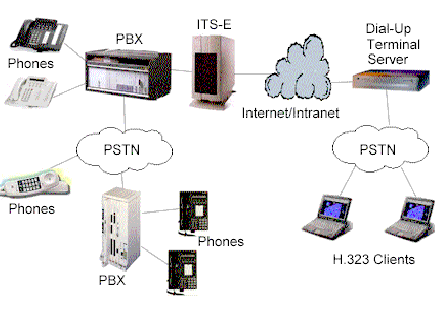 計(jì)算機(jī)IP電話產(chǎn)品,類似網(wǎng)絡(luò)會(huì)議系統(tǒng),允許用戶使用他們當(dāng)前的IP聯(lián)接把通話接到電腦上去(如通過以太網(wǎng)聯(lián)接到他們的局域網(wǎng)中)。這種作法的局限是PC用戶只可以與另一PC用戶通話。然而,使用ITS-E,這種局限將不存在。任何在網(wǎng)絡(luò)上的PC可使用H.323(用于IP電話上的ITU-T標(biāo)準(zhǔn))軟件包來實(shí)現(xiàn)通話,如微軟的網(wǎng)絡(luò)會(huì)議系統(tǒng),通過ITS-E服務(wù)器通至一個(gè)常規(guī)的電話使用者。電話用戶不需要任何新的裝備,甚至不會(huì)意識(shí)到聲音是從PC機(jī)中傳出及在IP網(wǎng)絡(luò)中傳輸。示意圖如下: