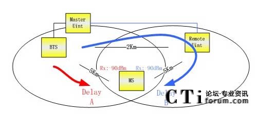 需要考慮GRRU站時(shí)延的引入對(duì)系統(tǒng)造成的影響。可能存在覆蓋區(qū)與施主扇區(qū)覆蓋區(qū)重疊的可能,如果兩重疊信號(hào)時(shí)延差小于4TA則不會(huì)造成任何問(wèn)題,這是GSM規(guī)范規(guī)定的。當(dāng)兩信號(hào)時(shí)延差大于4TA且信號(hào)強(qiáng)度相當(dāng)(差值小于10dB)則將導(dǎo)致手機(jī)掉話;因此,這時(shí)需要考慮選取背向光纖直放站覆蓋區(qū)的施主扇區(qū),這樣基站重疊區(qū)和直放站重疊區(qū)就不會(huì)產(chǎn)生多徑引起的掉話了,而是兩個(gè)扇區(qū)信號(hào)的切換。