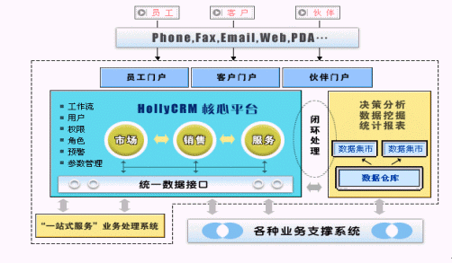 HollyCRM通過EAI與企業(yè)原有的業(yè)務系統(tǒng)充分整合,有效解決了阻礙企業(yè)內(nèi)部信息良性流轉的"信息孤島"現(xiàn)象。HollyCRM將分析型CRM產(chǎn)生的客戶價值和經(jīng)營分析結果實時反饋到運營型CRM中,通過協(xié)作型CRM提供的接觸渠道,針對不同客戶提供個性化的營銷、銷售和服務活動。HollyCRM實現(xiàn)了整個企業(yè)信息的閉環(huán)、良性循環(huán)。