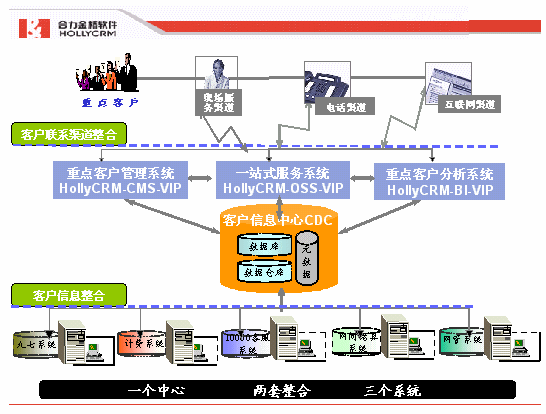 HOLLYCRM(合力金橋軟件)基于電信行業(yè)IT發(fā)展和山東省通信公司重點(diǎn)客戶管理系統(tǒng)建設(shè)目標(biāo)和原則的要求,根據(jù)多年來對電信CRM領(lǐng)域的研究以及在實(shí)際項(xiàng)目建設(shè)實(shí)施過程中的經(jīng)驗(yàn)獲得,科學(xué)地提出了針本項(xiàng)目的"一個(gè)中心,二套整合,三個(gè)系統(tǒng)"的建設(shè)理念。如下圖: