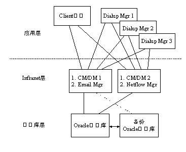 硬件平臺呈3層結(jié)構(gòu),分別為應(yīng)用層、Infranet計費和用戶管理層以及數(shù)據(jù)庫層。