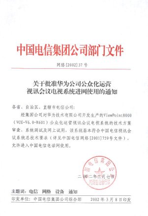日前,在中國電信集團公司組織的“新視通”公眾化視訊運營許可證的測試中,華為公司具有完全自主知識產(chǎn)權(quán)的“視點通”ViewPoint 8000綜合視訊系統(tǒng)以其先進的設(shè)計理念和卓越的產(chǎn)品性能,順利通過測試,成為業(yè)界第一個獲得中國電信集團公司公眾視訊運營許可證的產(chǎn)品。同時華為公司也成為目前業(yè)界唯一獲此認(rèn)證的設(shè)備供應(yīng)商。