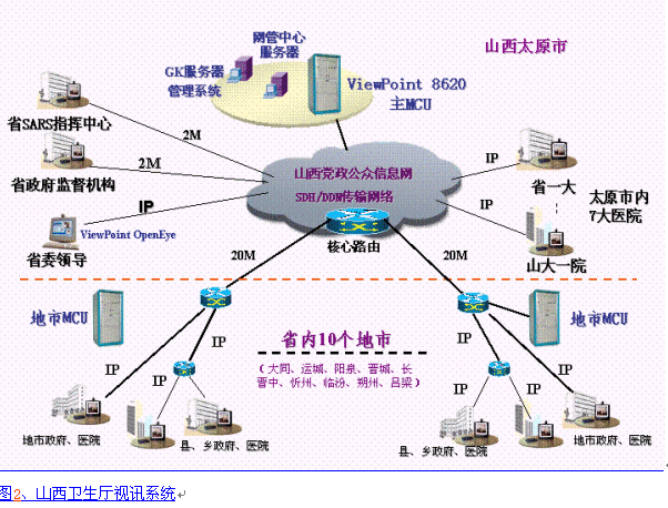 8000綜合視訊系統(tǒng),主會(huì)場(chǎng)設(shè)在非典防治指揮中心,利用現(xiàn)有的山西黨政公眾信息網(wǎng)絡(luò)及通信部門(mén)緊急支援的2Mbps數(shù)據(jù)專(zhuān)線(xiàn),整個(gè)系統(tǒng)采用H.323協(xié)議,在省內(nèi)7大醫(yī)院、及省政府有關(guān)部門(mén)使用ViewPoint