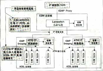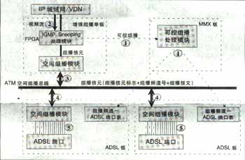 可實(shí)現(xiàn)高效的兩級(jí)組播;诳臻g總線(xiàn)上的組播信元技術(shù)實(shí)現(xiàn),與組播用戶(hù)數(shù)無(wú)關(guān),同一節(jié)目即使所有用戶(hù)加入該頻道,僅需復(fù)制一份,不用逐個(gè)用戶(hù)復(fù)制到每個(gè)用戶(hù)端口,極大節(jié)省了背板帶寬,減輕IP上行負(fù)擔(dān)?蓪(shí)現(xiàn)高性能硬件組播轉(zhuǎn)發(fā)。IP上行板采用超大規(guī)模FPGA硬件邏輯處理組播報(bào)文,ADSL板采用空間組播處理硬件芯片自動(dòng)完成向每個(gè)ADSL端口(用戶(hù))的組播復(fù)制,每ADSL端口組播帶寬6M。