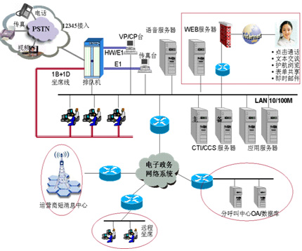華為12345政府熱線系統(tǒng)解決方案,是一個集語音技術(shù)、通信技術(shù)、計算機網(wǎng)絡、數(shù)據(jù)庫技術(shù)于一體,支持電話、傳真、電子郵件、Web等多種媒體接入方式的呼叫中心解決方案。該系統(tǒng)充分考慮了政府服務熱線的現(xiàn)狀及存在的問題,并結(jié)合了政府特點的運作模式,是華為公司在多年呼叫中心開發(fā)合作工作經(jīng)驗積累基礎上推出的解決方案。整個系統(tǒng)整體結(jié)構(gòu)如下:
