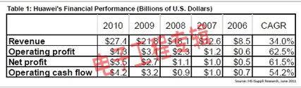 華為已經(jīng)取得了強大的地位,國內外銷售均快速增長。該公司過去四年營業(yè)收入增長了兩倍以上,2010年營業(yè)收入從2006年的85億美元上升到274億美元。